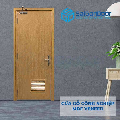 Cửa gỗ công nghiệp MDF Veneer tương tự như gỗ HDF, được sản xuất chủ yếu từ hỗn hợp bột sợi gỗ mịn, chất kết dính và keo chuyên dụng. Tấm ván gỗ MDF Veneer có độ dày hơn hẳn nhờ được nén dưới áp suất trung bình.  Lớp vân gỗ được phủ trên bề mặt của có tác dụng chống ẩm, chống thấm nước.